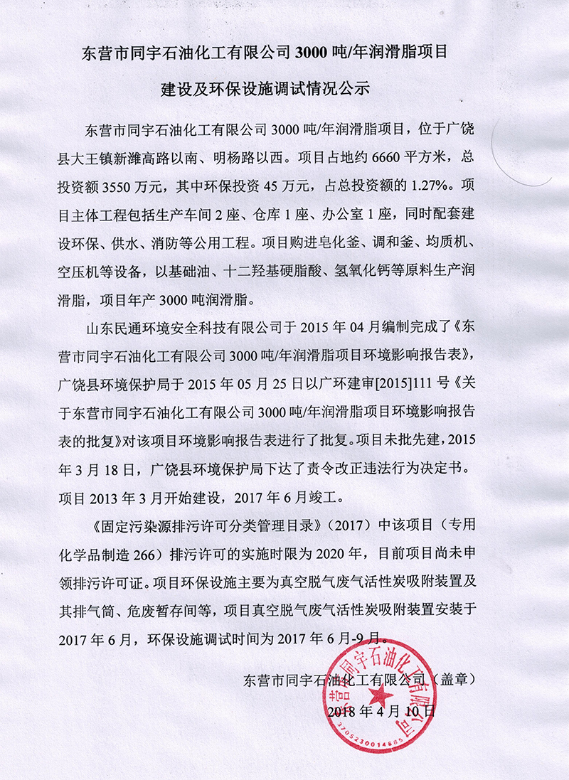 東營(yíng)市同宇石油化工有限公司(蓋章) 2018年4月10日 |